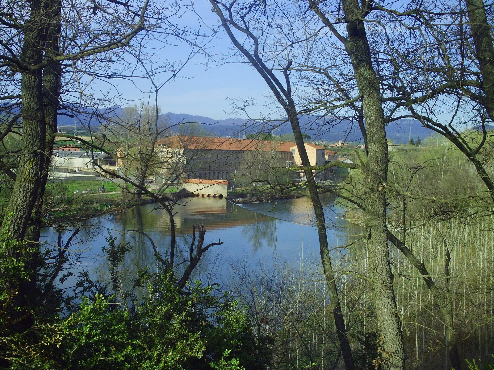 Després de visitar la sala hem agafat el cotxe i hem anat cap a l’estació de Manlleu i hi hem aparcat. La intenció era anar a l’altra banda del riu Ter per retratar unes fàbriques que hi ha prop de la carretera que uneix Manlleu amb la Gleva. Una és Can Dolcet, l’altra la Colònia Rusiñol i també hi han les instal·lacions de la Piara que també he acabat retratant. Però tot des de la banda contrària del riu. Per dir-ho d’una manera, des de la banda de Vic. Per arribar allà hem hagut de travessar el riu pel pont de la via del tren, per una passarel·la de planxes de ferro, on es recomanava no votar per no traspassar-les. Arribats a l’altra banda hem baixat per un corriol cap a la ribera i hem continuat direcció a les fàbriques. Hem passat pel costat d’una font. L’Assumpta m’ha dit que per allà, antigament la gent s’hi banyava com si anés a la platja. Hem continuat, enfilant-nos per uns camps i seguint per la vorera. En arribar a una casa de pagès abandonada, ja érem davant de la fàbrica de Can Dolcet però no es veia, per culpa de ser una zona molt espessa d’arbres. Solució: hem baixat el marge i ens hem apropat fins la vora del riu des d’on he pogut tirar vàries fotos.
