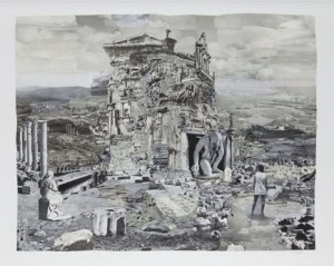 En l’exposició de l’Artur Ramon, Piranesi serveix d’amfitrió a l’obra de Pablo Milicua (1960), nebot del historiador de l’art, però que no necessita padrins per defensar l’obra artística que executa: les peces que exposa a la galeria barcelonesa són grans col·lages de fotografies, que construeixen monuments imaginaris, ciutats, temples o palaus ideals situats molts d’ells en muntanyes o estructurats de forma piramidal. Així el pastitx prejudicial d’entrada es transforma en l’observació acurada de les petites imatges que formen part de l’estructura.