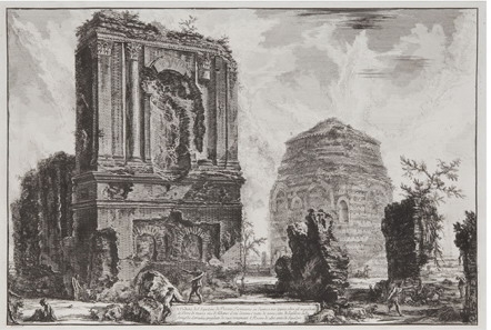 De Piranesi s’exposen algunes de les seves vedutes de monuments i ruïnes romanes: la Casa Aurea de Neró, la vil·la Adriana, la base d’una columna commemorativa –no és la trajana-. L’obra del italià data de finals del segle XVIII i com ja sabem constitueix un exemple de l’exercici de Piranesi per amplificar a través del gravat, la grandesa de l’arquitectura romana, a través de les seves ruïnes. Un discurs arquitectònic que s’oposava a la defensa que d’altres feien de l’arquitectura clàssica grega (Winckelmann).