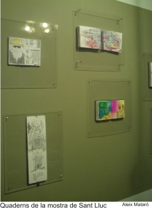 Però el motiu real de la visita a la ciutat era visitar el Cercle Artístic de Sant Lluc, on d’alguna manera hi ha la primera col·lectiva que faig a Barcelona. Es tracta d’una petita mostra amb els quaderns de dibuix del curs “Dibuixant la ciutat”, que vaig fer el curs passat. Hi ha tot l’àlbum amb el centenar d’esbossos. En Víctor Martínez, Swasky, ha estat qui ha muntat l’exposició. També hi ha el seu quadern, dos del Miguel Herranz, el del Isaac Dueñas, en Josep Maria Portet… crec que hi ha el de la Trini i el d’algun altre alumne. Estan exposats a la paret, aixecats i aguantats per sota per cargols i protegits per vidres. Al costat del panell expositiu també hi ha una televisió amb una sèrie de vídeos que ha fet el Víctor ensenyant cada un dels quaderns. Per veure el vídeo aneu a: