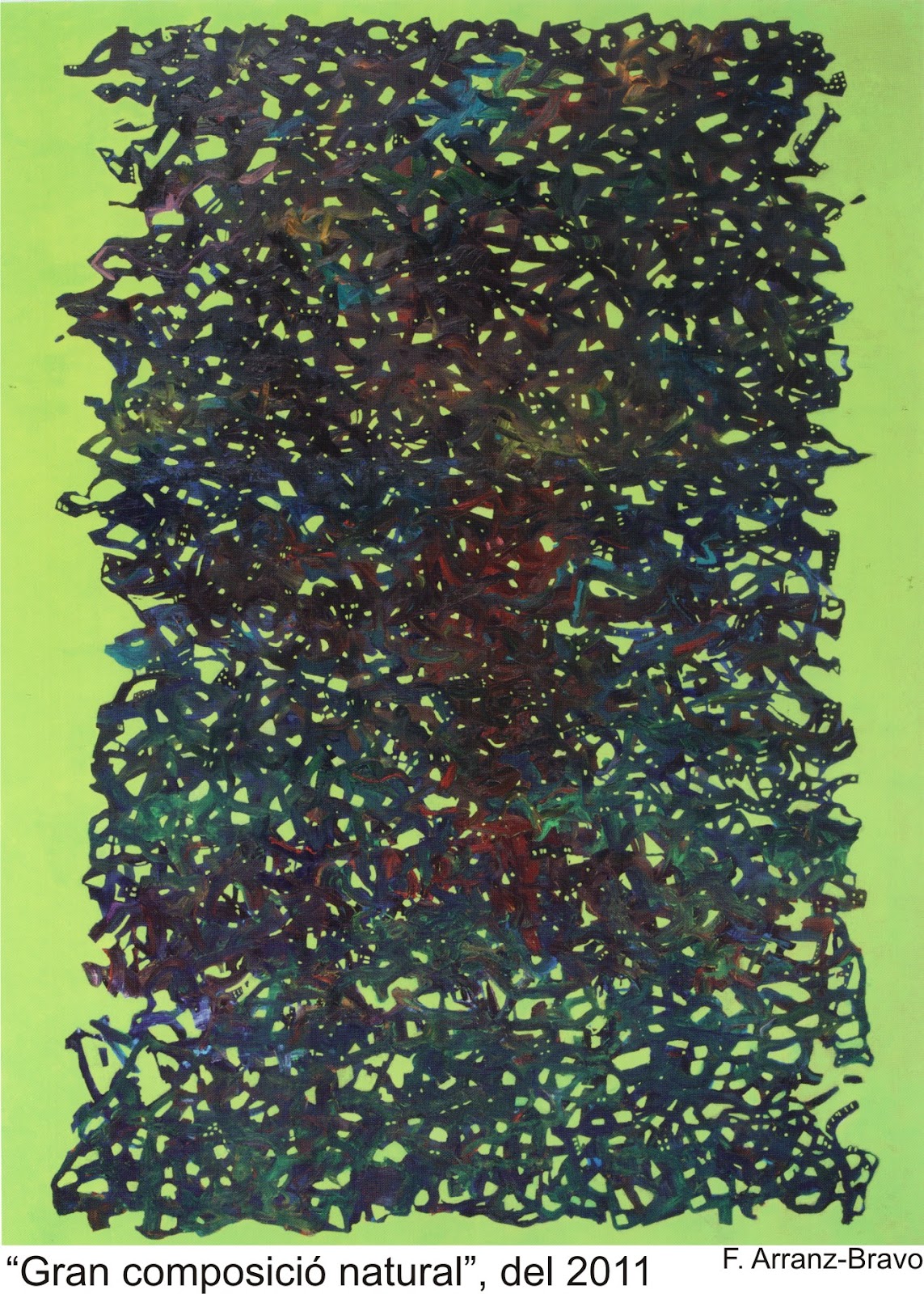 Però aquestes obres s’aturen i apareixen les pintures que dominen l’última part de la mostra. De fet es tracta de grans composicions i díptics en que hi destaquen aquelles xarxes de colors que contrasten amb el fons d’un color viu o clar. Apareixen altres gammes de colors –verds pàl·lids, torrats, negres-, tons com més dramàtics. Finalment seran les mateixes xarxes les que jugaran amb tons diferents crean com una espècia d’aurores boreals. No he vist encara l’exposició, però fotografies de detall permeten veure que gasta bastanta pasta pictòrica. En l’obra d’Arribas, trobem per tant un discurs cronològic clar, expressiu i potent. La mostra es pot veure fins el 29 d’abril.La Tecla Sala és una antiga fàbrica tèxtil reconvertida en biblioteca –crec que és la més gran de la Diputació-i espai d’exposicions. Està ubicada a l’avinguda Josep Tarradellas, 44 de L’Hospitalet.