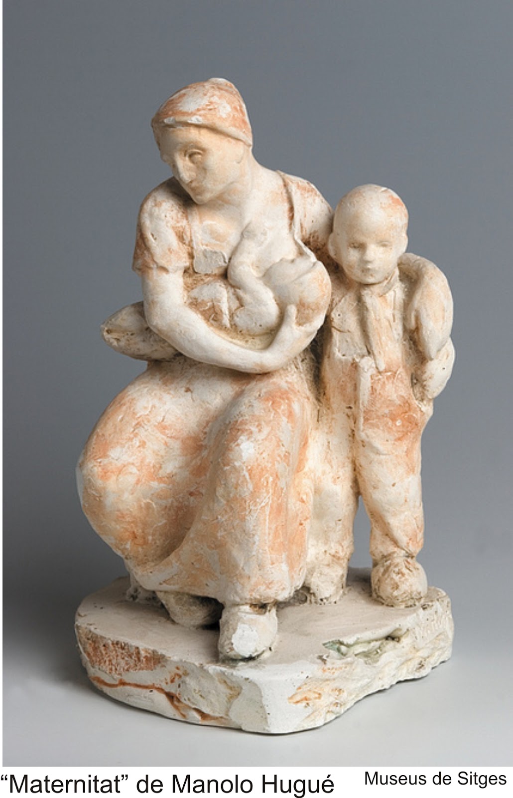 Trobem també obres d’artistes contemporànis a Rusiñol, com són les obres de Joaquim de Miró o d’altres artistes més joves, com Isidre Nonell, exactament deu anys més jove. També escultures de Manolo Hugué, com una maternitat, crec que és de guix o d’un material moldejable i que per tant ens situa als estadis més propers a les mans de l’artista. La presència d’una obra de Casagemes ens porta a la memòria el trist record del seu final tràgic, ja que estant a París amb Picasso, es va suïcidar per un rollo amorós.