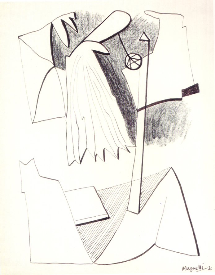 Per conèixer les arrels creatives de Magnelli no hi ha uns documents millors que els seus dibuixos. Les pintures plantegen el problema desenvolupat i amb moltes decisions preses. Però els dibuixos enceten el camí creatiu, posen sobre el paper de forma instantània les primeres idees, tantejos, aproximacions. Encara que es tracti de dibuixos polits, ben desenvolupats i ben acabats. Magnelli prescindeix moltes vegades, en els seus dibuixos, del color. Són nomes traços, formes, siluetes d’idees abstractes allunyades de la naturalesa, la geometria familiar i referents objectuals evidents. Magnelli treballa amb tinta i llapis. El primer serveix per delinear, evitant errors. El segon per crear zones ombrejades o texturades. La presència de formes ametllades recorda a ulls i suggereix que l’artista crea personatges, una mica com feia Miró, però és una interpretació lliure. En qualsevol cas estem parlant de iniciatives plantejades per carreres paral·leles.