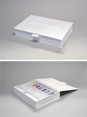 Eva Pujol participava amb una caixa en forma de llibre blanc, que s’obre per la mateixa portada i mostra a dintre compartiments amb potets, alguns buits i alguns plens de material de colors. També hi ha una xeringa. L’Eva m’ha enviat un text que acompanyava l’obra, que us el copio i enganxo tal qual l’he rebut.