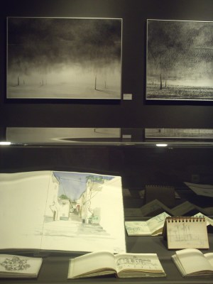 Tornem a l’exposició: la sala de la Plana de l’Om és un espai amb passat gòtic, que conserva arcs apuntats de pedra a cada tram de la seva planta rectangular, llarga i estreta. La Marina ha organitzat la seva revisió d’acord amb el circuit que formen els trams i hi ha sumat una vitrina amb quaderns i llibres d’artista, així com un pedestal amb un vitrall. La mostra es centra amb el dibuix i la pintura, amb la mateixa franquesa com ambdós llenguatges formen part de la biografia de la Marina. Hi trobem des de les grans obres pictòriques i tintes amb regalims i intervencions de caràcter filiforme, com representants de la seva etapa de grans dibuixos de “Traços del gest”.