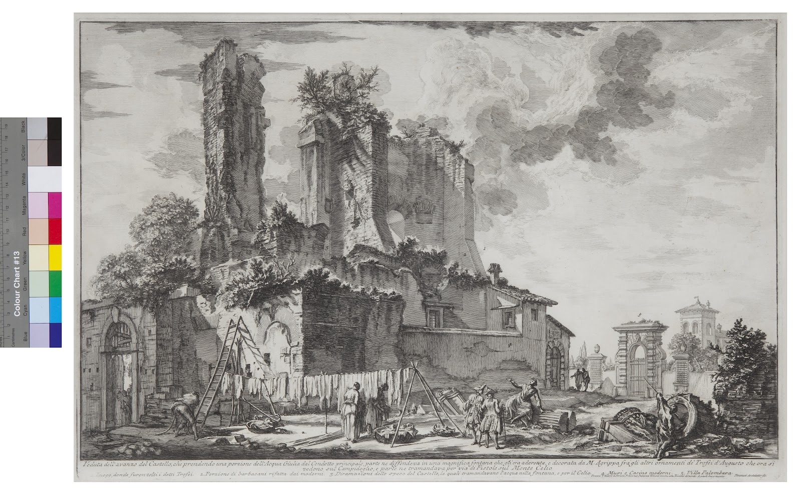 Piranesi treballava amb la tècnica de l’aiguafort, que com la punta-seca o l’aigua-tinta, utilitza planxes de metall, normalment de coure. Les planxes es tapen amb barnís, es dibuixa a sobre amb un punxó i es posen en àcid. La solució es menja la línia de coure, netejada amb el punxó per fer el dibuix, i forma els solcs que s’ompliran de tinta per estampar. En aquest sentit, seria interessant saber si Piranesi feia esbossos, in-situ, dels monuments i detalls, ja que tot i el toc romàntic, són d’una gran precisió realista.