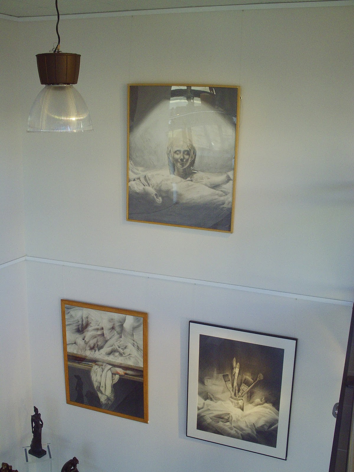Els seus dibuixos són esplèndids. Les obres que presenta, tant d’una tècnica com de les altres, pertanyen als últims anys i als últims mesos. Té una manera de treballar en que la trama de línies ajuda a definir, no només llums i ombres, sinó volums i formes. Les línies de trama manen. A vegades combina aquestes “trames orgàniques” amb descripcions més realistes de la qualitat matèrica d’objectes –pots de pinzells, draps, cavallets. A vegades resulta difícil explicar lògicament els límits entre objectes i trames, però de seguida l’obra ens recorda que ens trobem davant una imatge plàstica i lliure.