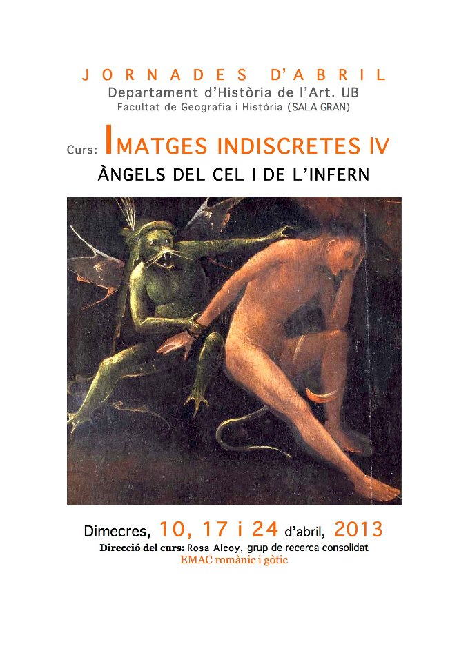 Com veieu aquest seminari té un àmbit major que el del simposi que s’inscrivia en els dos grans estils medievals. Enrico Pusceddu parlarà de l’arcàngel Rafael i de la pesta, en el segle XV, i el mateix dia (dimecres, 17), Cristina Fontcuberta parlarà del tema iconogràfic del dimoni a l’orella, durant l’Europa moderna. Alba Barceló seguirà en el seus estudis sobre art hebreu català i cercarà en els llibres d’aquesta cultura els éssers alats. Però aquest seminari també proposa un repàs interdisciplinar: Enric Ciurans parlarà dels àngels i dimonis en el teatre català (dimecres 17, ala tarda). I l’últim dimecres, el dia 24, Josep Casals farà una immersió del tema en la literatura del segle XX, mentre que Aleix Cort parlarà d’àngels i swing. D’aquesta manera es proposa un repàs de la història d’aquests éssers centrant-se en qüestions concretes. Us enganxo l’enllaç a la pàgina de l’Emac on podreu aclarir el programa i informar-vos de la inscripció: http://www.ub.edu/emac/. Hi ha una matricula de 55€ i 40 per estudiants, antics alumnes dels cursos i aturats.