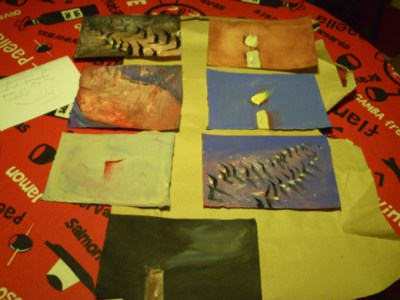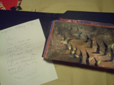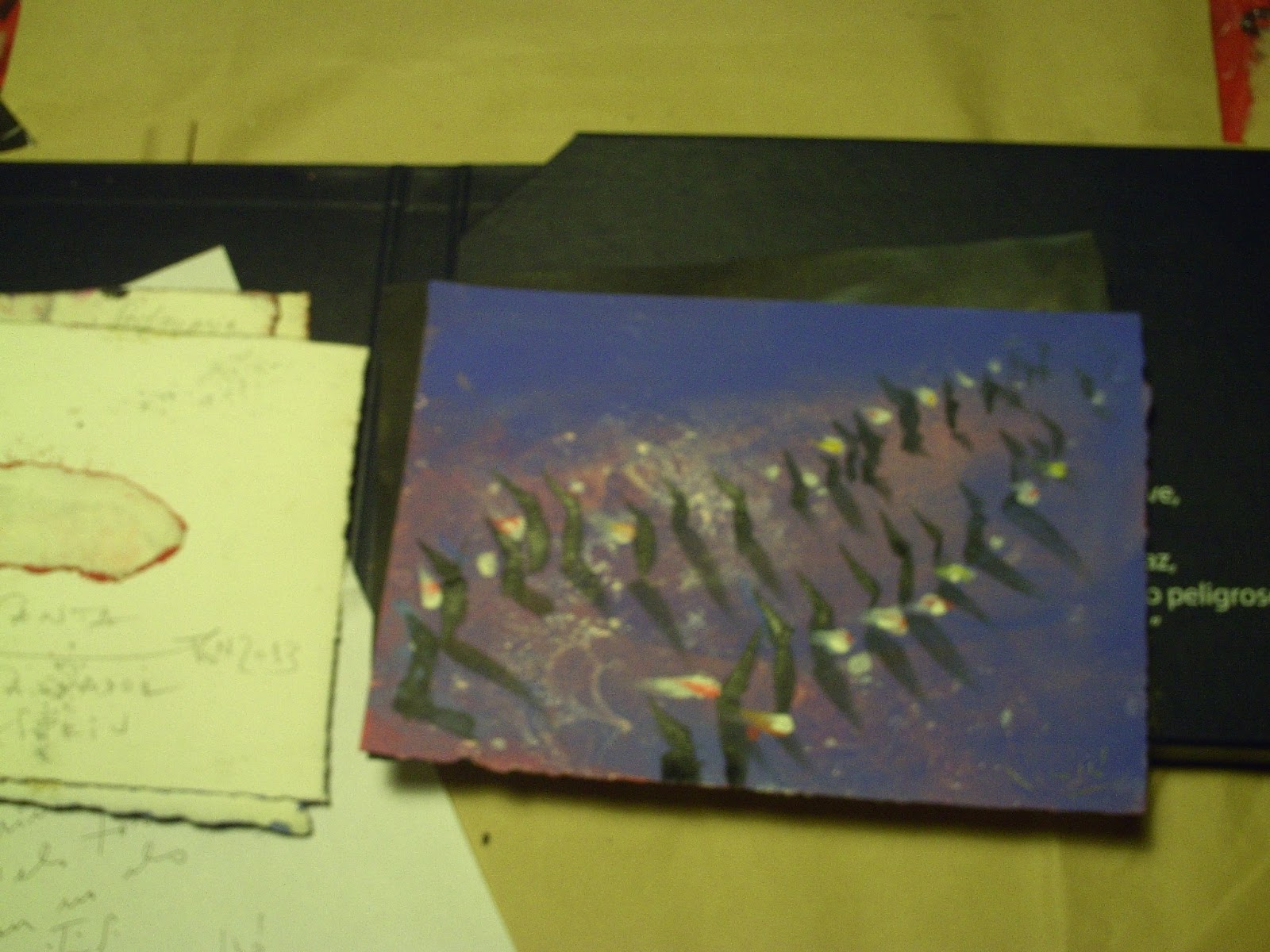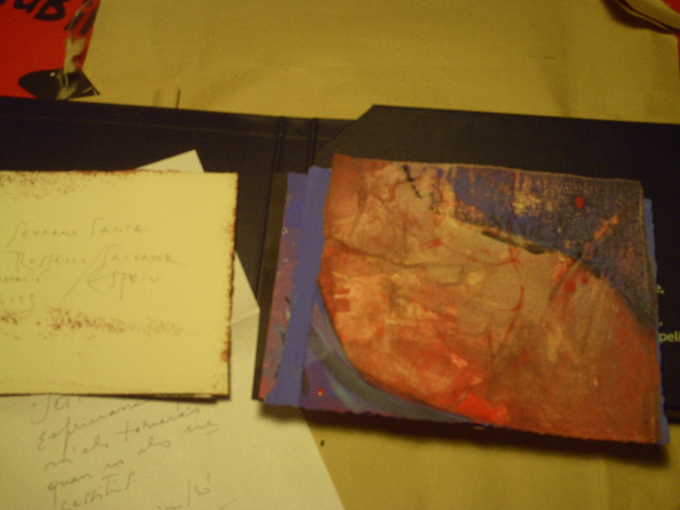 Els set dibuixos de Rosselló els vaig rebre molt ben embolicats i protegits a casa. Com que el contingut del sobre era nou i es tractava com d’un descobriment vaig retratar el procés de desembolicar-lo com si obrís un sarcòfag egipci. Primer el sobre de paper craft i després una caixa molt xula, aprofitades i amb una inscripció adient, una cita antiga sobre art. El contingut final són els set dibuixos de Rosselló, fets amb pintura, tractada a vegades com aquarel·la, a vegades amb un sentit més opac. A Rosselló li agraden molt els colors. Però el meu record de set anys endarrere era que l’artista tarragoní tenia un estil d’arrel més classicista. Però no vull dir carca, sino que feia unes figures d’aire llatí, amb arrels etnogràfiques en els pobles del Mediterrani. I també de colors era molt alegra. En canvi en els dibuixos que he rebut trobem un Rosselló més fosc, que defuig la descripció, inclús la narració, i cerca més donar una impressió. Vist en conjunt trobo que és una sèrie bonica. Els blaus encara són marítims i el color segueix sent important, però potser l’artista ha madurat i cerca altres etapes expressives. Caldria una mostra retrospectiva dels últims set anys, de l’artista per valorar-ho millor. Els seus dibuixos són set perquè agafa el sentit de “setmana”, de set dies, per fer la seva visió de la suite d’Espriu. Les pors i foscors de l’Espriu potser connecten també amb l’ara del pintor, que com molts sofreixen la crisi econòmica i social dels nostres dies. Rosselló hi dóna tocs d’esperança –els seus blaus i els seus colors són optimistes-, perquè és dels que no es rendeixen. Com l’Espriu, que si bé s’interessa per uns temes pessimistes i dolorosos, va anar fent i no va deixar d’escriure pas mai. Never give up!