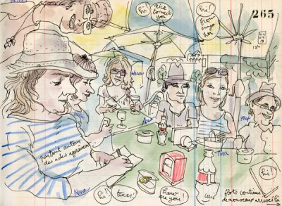 Els primers dibuixos de la mà de Lapin ens parlen de les primeres trobades i coneixences entre els participants al simposi. Com que els quaderns va bé obrir-los al voltant d’una taula amb una cervesa, parlant i xerrant, aquesta és la idea general dels primers dibuixos que mostren el personal reunit i ja obrint, de forma automàtica els respectius blocs.
