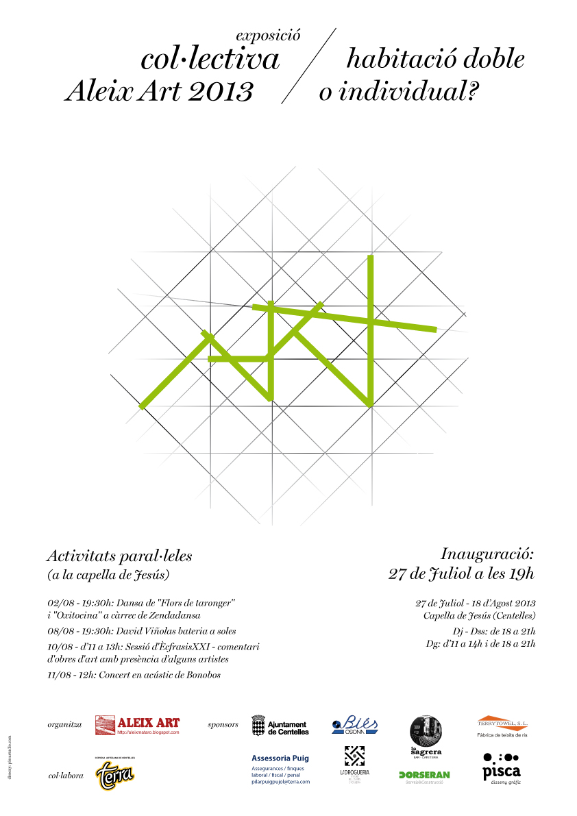 El fet que triés aquest tema respon a la idea de que, d’alguna manera, l’exposició podia reflectir un capítol autobiogràfic de l’autor del blog. Fa casi un any que m’he independitzat i el tema de viure sol o en parella em va semblar adient i universal per a tots, ja que forma part de les etapes de la vida i de les circumstàncies de cadascú. Si l’any que ve es repeteix una col·lectiva, amb els artistes citats entre l’agost del 2012 i el 13, potser el tema serà de caire més social, atenent a l’existència d’una secció del blog dedicada a aquests temes: Tint Social.Però ara estem a la vigília de la inauguració de la primera Col·lectiva. La que funciona per si sol. Si pot servir de carta de presentació, crec que la Col·lectiva Aleix Art diposa ja d’una marca pròpia que es troba en la imatge del cartell de la mostra. Dissenyat per l’estudi Pisca, mostra com una “serp” de color pistatxo que s’arrossega per sobre una xarxa. Les dissenyadores hi volien suggerir la generació de la paraula “art”. Sigui com sigui, és un disseny original i identificatiu que espero que no trigui a associar-se amb aquesta iniciativa expositiva del blog Aleix Art.