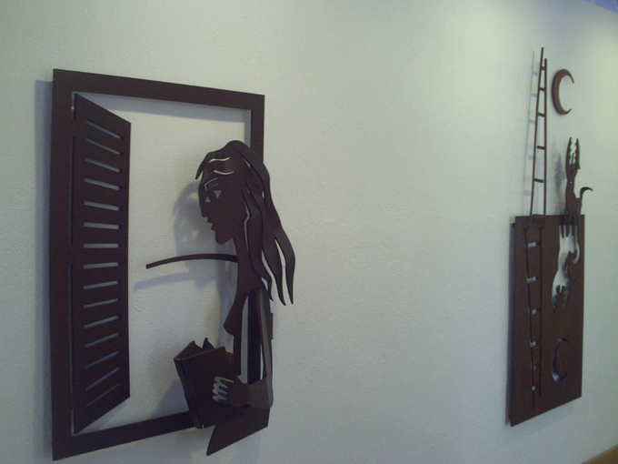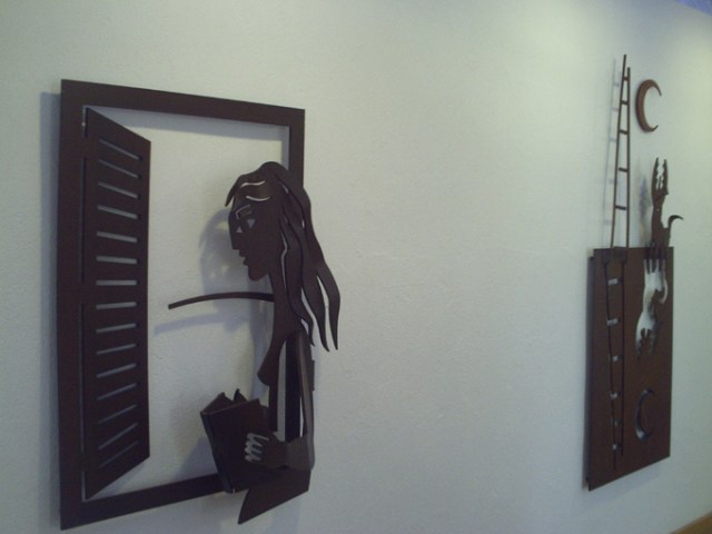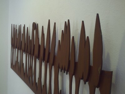 Tornem a la sala exposicions. A cop d’ull les obres presentades parlen dels temes de sempre, però s’ha de dir que ho fan d’una manera més complexa. Hi ha tres tipus d’escultures: les obres de ferro exemptes, que s’aguanten per si mateixes. Els relleus de ferro, que es pengen a la paret i les obres emmarcades que són els relleus de cartró treballat i pintat.