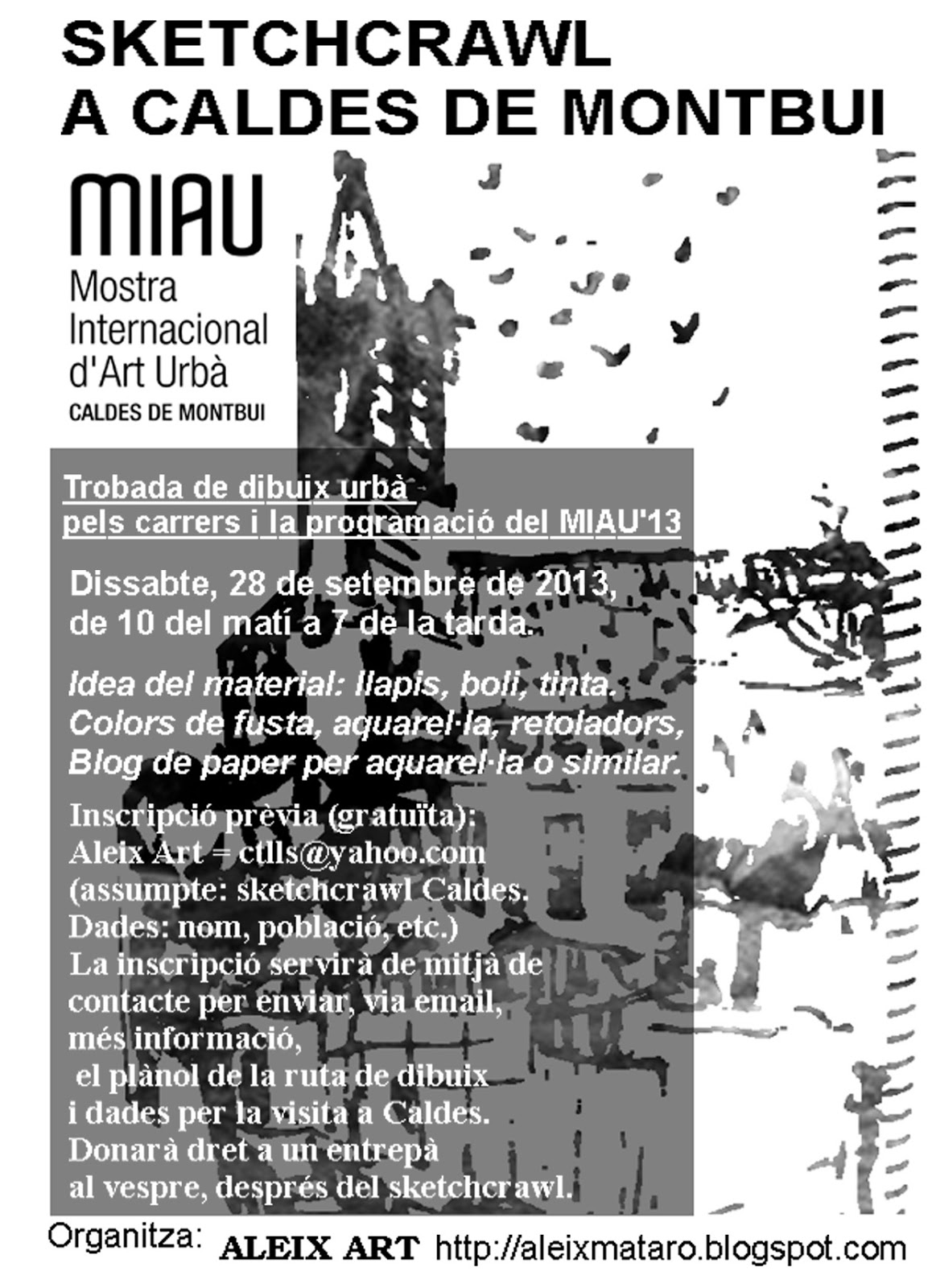 Centelles. Fem pública ja la convocatòria d’una trobada de dibuixants urbans –sketchcrawl- a Caldes de Montbui. Pot venir qui vulgui dibuixar, sigui iniciat o no en aquest mundillo dels anomenats “urban sketchers” o dibuixants urbans. Serà el dissabte, 28 de setembre de 2013, a partir de les 10 del matí. Hi ha molt per dibuixar i veure. Serà aquell dia perquè és quan hi ha la Mostra Internacional d’Art Urbà (MIAU), que esta programant tota una sèrie d’accions, per fer aquell dia. L’sketchcrawl resseguirà els carrers càlids i nobles de Caldes i es posarà entre mig de la programació del MIAU –de la qual també en forma part-.