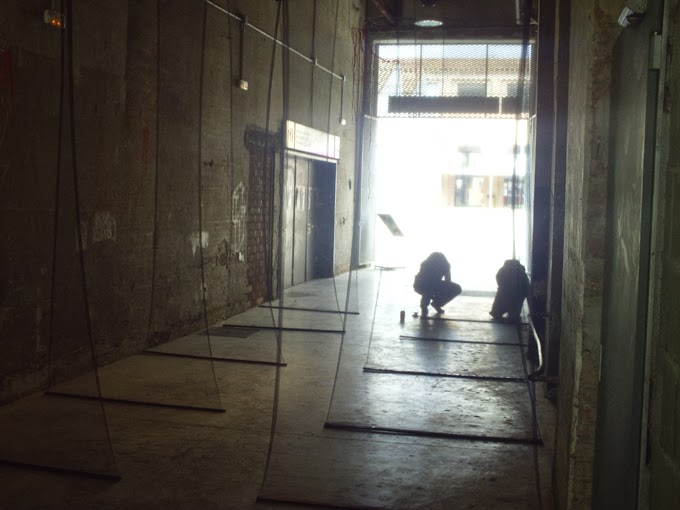 A l’altre cantó del passadís hi ha la Tèrmica. I a dintre hi vaig trobar un altre trio d’artistes, un col·lectiu casi format per l’ocasió, per Carles Azcón, Meri Farnell i Angel Gama, que estava preparant una performance que ajuntava música, pintura i acció, “Re-evolució industrial”. L’espai de la Tèrmica és molt xulo, amb els altells de ferro, escales i les màquines i aparells intactes. Segur que el muntatge havia de ser impressionant, a l’hora que s’havia d’estrenar, que havia de ser en un moment més fosc del dia. Eren les dues i a la colla, no els hi molava massa haver d’avançar detalls del seu projecte, a un desconegut.