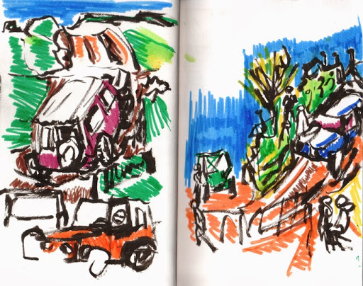 En aquest ambient vaig estrenar uns retoladors que havia comprat al matí, per intentar fer un esbós ràpid del moment. L’Avelino no se si en té la culpa. Qui sí, uns retoladors que corrien a l’aula del grup Baobab, amb els que vaig acabar el dibuix de la Roca Umbert, publicat a la portada, fa una setmana. Els retoladors són diferent que l’aquarel·la líquida i em ve de gust investigar-ho. Per això ahir, a la Gavarra vaig fer aquest esbós, que reconec té un toc naïf. A vegades es fa una passa endarrere, per fer-ne dues endavant.