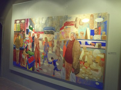 La reelaboració del tema central de “La ronda” és recurrent en les altres pintures i sobretot en les aquarel·les concentrades en la planta baixa del claustre. Són papers enormes. L’artista revisita els temes que persegueix per l’obra definitiva: la parada de formatges que surt a vàries teles i papers, ell mateix ens confirma que li serveix com a exercici per pintar diferents textures i tonalitats. I també perquè al pintar aquests productes, de forma bastant geomètrica i amb colors plans, li sembla que és com si pintés les arquitectures “ideals” dels fons dels quadres reinaxentistes de Fra Angelico. El Renaixement és un referent important en l’obra d’Artigau, que li inspira rostres, però també l’aire clàssic de les figures. Això i el tractament com de fresc erosionat que tenen les seves obres, tant d’olis com d’aquarel·la, ens fa imaginar que Artigau voldria ser com un nou Masaccio –pintor de frescos-, però del nostre temps i dels nostres espais.