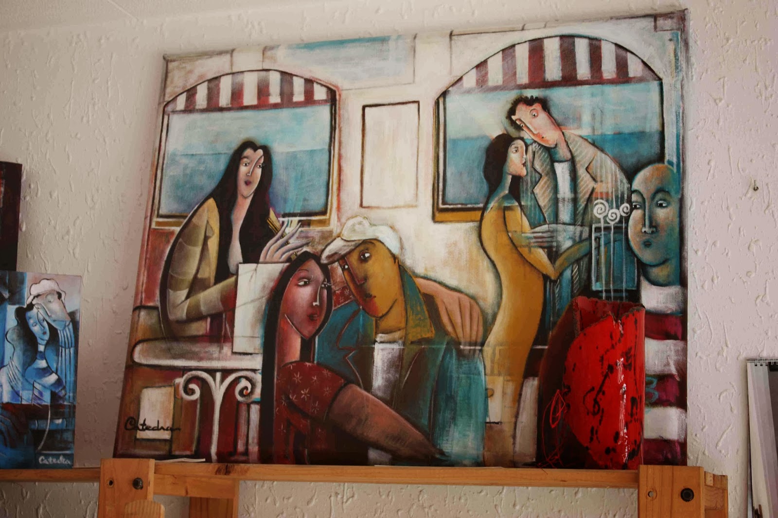 o dels pintors de l’anomenada “Escola de París”. Però si ens hi fixem, hi ha dos referents encara més importants: la il·lustració i la música. Les figures beuen molt d’un aire narratiu. I Núria Cátedra ens confessa que després d’estudiar belles arts, va passar uns anys il·lustrant històries. Però que un dia, es va sentir més interessada per traslladar aquest estil gràfic a gran format i dotar-lo de temes més personals. Aquests temes, pel què veiem, parlen molt d’històries de parelles, de moments viscuts, de viatge –per exemple, Cuba és també un referent important- i també, d’instruments i notes musicals. La seva pintura fa pensar amb el jazz. Em sembla poètica i inquietant. Hi ha motius que es van retrobant, però també hi ha canvis que la Núria ha introduït en la seva “fórmula màgica”: