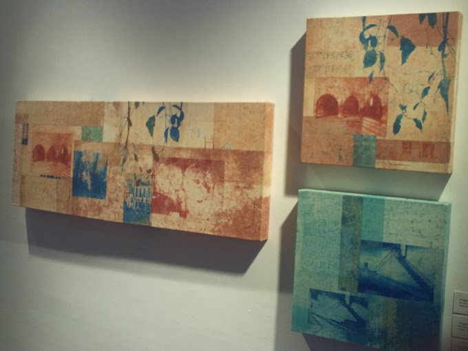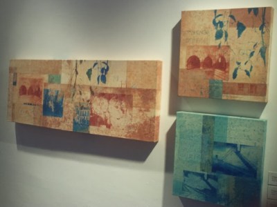 El cas és que és una obra que amb només tres segons atrapa. Temps d’obrir la porta i mirar. Els colors són molt atractius: turqueses, terrossos, bordeus. Colors que protagonitzen teles i també que reapareixen sota cada fons dominat per un dels tons. Això a la planta de baix. La Sala Delguer té planta baixa i un primer pis. A la baixa, Permanyer hi exposava la col·lecció de pintures. No recordo bé si la pintura era acrílic o un tipus de tinta. El cas és que l’artista ho treballava com aquarel·la de grans camps tonals. O dit d’una altra manera: sobretot cerca efectes de transparències i baladures. Jocs de superposicions que es combinen amb textures i imatges transferides, que amb la seva pròpia marca sobreposada, crea una nova “cortina” de color i formes.