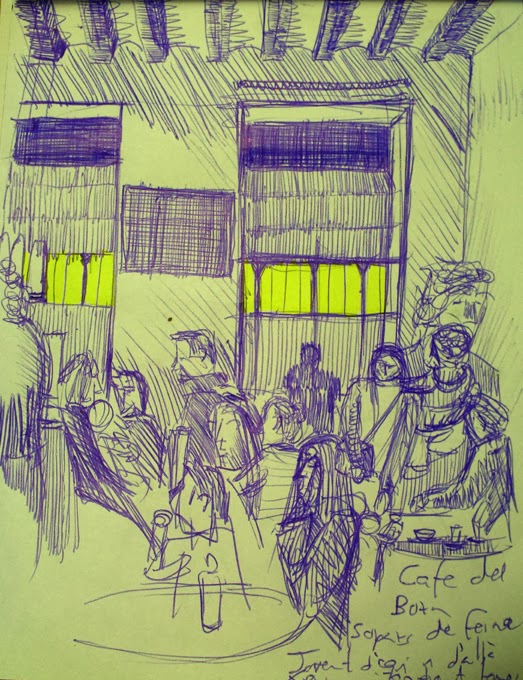 El diumenge a la tarda, Nou Estil havia organitzat una ballada dels alumnes petits i grans, en benefici de Càritas. Platea i galliner es van quedar plens per veure l’espectacle. Un servidor tenia ganes d’exercitar la mà i vaig poder “colar-me” dalt l’escenari, amagadet en un racó, per prendre nota gràfica del moviment coreogràfic. Dansaires de pocs anys i de més crescuts, tots amb una bona dosis de nervis, van anar desfilant a ritmes de diferents músiques actuals i de sempre. Dibuixar els moviments costa una mica, perquè d’entrada no saps massa què dibuixes: van sortir un parell de figures siluetejades amb un sol traç. I més tard vaig començar a detallar figures individualment. Però en general és un moment de batalla, que suposo amb el temps es pot anar educant i dirigint a fites concretes. Al bar de La Sagrera aquest cap de setmana passat també han fet uns esmorzars solidaris. El 10% del recapte anava a Càritas.