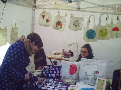 Entre els paradistes, a fora al Passeig, també hi hem trobat la Laura Ramos, il·lustradora i creadora d’objectes portables –pins, imants, etc- amb les seves criatures de conte. Aquest cop la Laura compartia stand amb una altra il·lustradora, la Laia Ferrate, que fa una mica el mateix i té com a logo un drac. Estaria bé que també participessin a la fira d’artistes, on entre tots podrem fer més pinya!