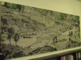 Però hi ha més obra del Musach que estava destinada a un “espai públic”. Quan hi havia l’Hostal de Can Giol, aquest pintor que també s’ocupava de la restauració de les parets, hi va fer una pintura de temàtica paisatgística, que ocupava el saló pels convits. L’obra encara es conserva al mateix lloc, ja que és tant gran que ningú pensa en moure-la. Avui forma part de l’habitatge d’uns veïns, que molt amablement me l’han deixat fotografiar.