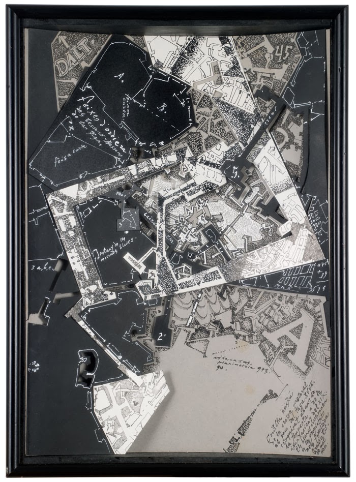 En l’exposició de l’Espai Volart hi ha pintura, dibuixos i també gravats. Vilacasas va ser un bon cultivador del gravat, traduint a l’aiguafort el seu concepte lineal. Per tant tindríem com ja dues etapes: una figurativa i l’altre abstracte. Després les tres o quatre etapes següents són variacions de la segona. Primer fa planimetries més lineals i de fons sobri. Després hi introdueix matèria i crea “mapes” amb textures. L’etapa informalista. Després recupera el pes de la línia i els plens fets amb pintura i finalment, en l’etapa que va des de mitjans dels seixanta fins al final, fa una espècia de planimetries amb pintura, d’un aire com més de disseny gràfic. Una etapa que certament és espectacular. En aquesta etapa, d’alguna manera m’hi sembla reconèixer les “planimetries a la romana” de Piranesi. Però en el cas de Vilacasas hi ha un major interès per crear ritmes i contrasts de fons de colors amb el to del traç i introduir formes geomètriques que es sobreposen o combinen. Una habilitat que, de fet, Vilacasas havia anat ja assejant tota la seva carrera. Però en aquesta etapa juga a mesclar solucions.