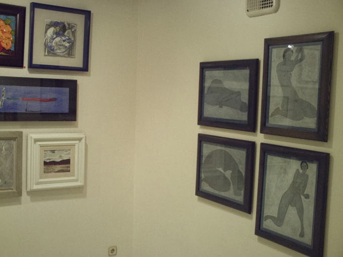 A prop de la il·lustradora hi ha l’aiguada que comentàvem de Beulas. Es tracta de tres papers tacats amb tintes aigualides amb diferents intensitats. Fa paisatges, no se si reals o inventats. Però són xulos. Sobretot el paisatge més gran, amb camps i muntanyès, de tons marronosos que recorda la Plana amb el Montseny.
