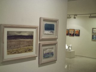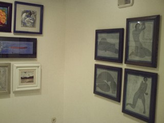 A l’entrada de la galeria també hi ha una peça de l’Artigau. Guinovart o Riera i Aragó no fallen mai entre les propostes d’aquest espai artístic vigatà. Recordem al pintor d’Agramunt amb unes teles intervingudes per la banda del bastidor, això és al revés. El pintor hi enganxava materials i hi aplicava pintura blava. Riera i Aragó el trobem entre els quadres que formen el mosaic d’obres petites, a la paret de la sala gran, amb una de les seves elices. Aquí també hi ha una peça de Núria Vall i fins dissabte al matí, n’hi havia una del David Casals. L’artista centellenc disposa de peces de reserva a l’espai més interior de la galeria. Es tracta de tres nocturns, un d’ell dedicat al mercat medieval.