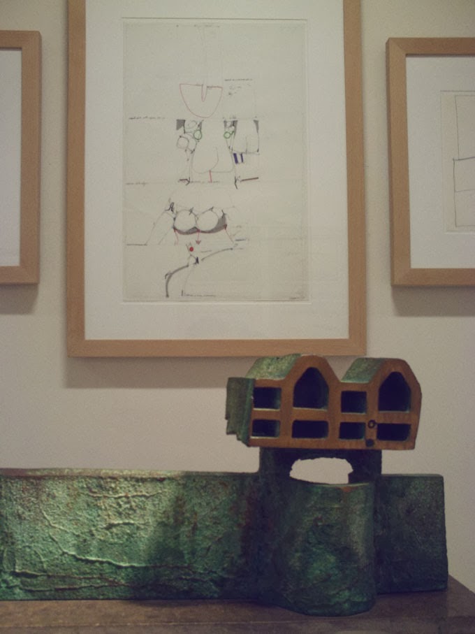 A part de molta pintura, l’exposició de petit format, també apropa obres d’escultura. Hem parlat de dues peces de Ricart. Són de caire geometricoabstracte. En una línia similar hi trobem també una escultura feta amb marbre de Carrara, per Enric Sala. Segons com sembla un gosset potes enlaire. Però també és una espècia de generació de cubs, sobre cubs. Més a l’entrada també hi trobem una espècia de maqueta escenogràfica, amb cartró pintat, feta per Marià Dinarés. Com a repàs de peces dels bons artistes de la comarca és una gran exposició.