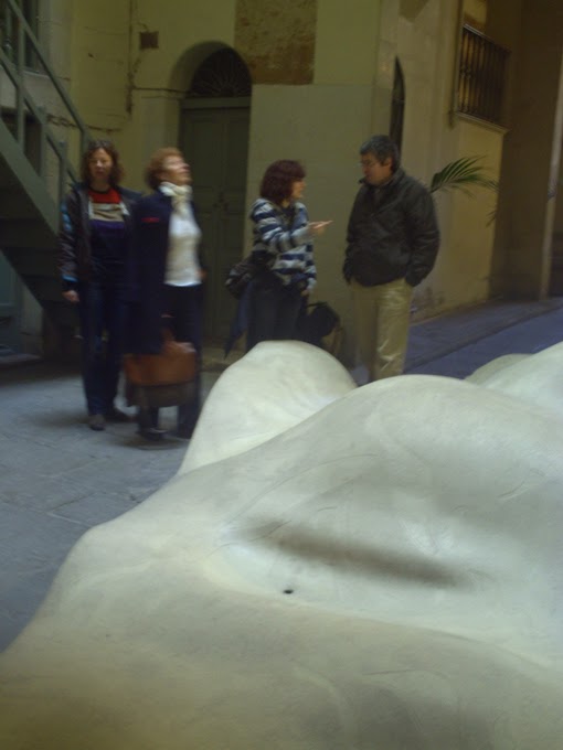 Barcelona/ Centelles. Aquest passat dissabte vam estar de visita per Barcelona amb la colla del grup ÉcfrasisXXI –dedicat a comentar obres d’art-. La missió va ser visitar l’exposició de la Fundació Miralles i l’hospital modernista de Sant Pau, després de la seva recent restauració. Amb el recinte hospitalari ideat per Domènech i Muntaner no hi va haver cap problema. Més aviat va ser una visita positiva o una experiència enriquidora. No era el primer cop que ens passejàvem pel lloc , però és un espai que crea complicitats amb l’esperit fàcilment, amb la seva forma orgànica, la llum i color dels pavellons i tots els detalls d’art ceràmic i arts aplicades. No està del tot restaurat, però si que varis pavellons han estat posats al dia i adequats per encabir-hi entitats institucionals, com l’Institut dels Boscos o varis organismes dependents de la ONU. L’adequació per aquests nous usos no interfereix en l’arquitectura original, sino que es tracta d’estructures de fusta, com de mecano que s’hi han afegit i creen departaments, nivells i mobles. El recinte principal de l’entrada és el que resta més buit, ara sols deixat pel gaudi del plaer del treball arquitectònic i la decoració ideada pel seu autor. Tant sols hi han reservat un auditori, també insonoritzat amb els llistons de fusta que trobem en altres espais condicionats per nous usos.