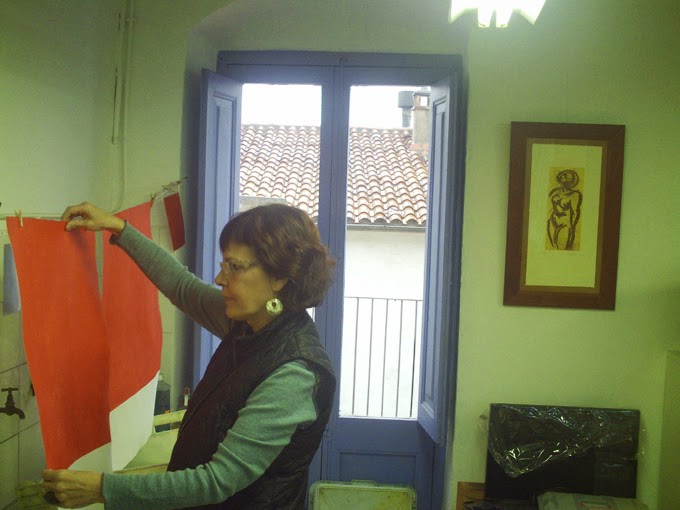 Les obres que es mostraran a El Trabuc, les vaig anar a cercar al taller que Rosa Permanyer té a Sant Feliu de Codines. Es tracta d’un pis en una casa vella. Disposa d’un bon tòrcul. L’artista estava fent proves dels gravats que participen a aquestes exposicions. Realment és una artista que ha de mesurar molt bé el temps, ja que té l’agenda molt plena: dóna classes d’art a Caldes. Ara ha acabat les classes a Sant Lluc, però també s’ha posat en nous projectes participatius amb els seus veïns i amics. És inquieta. També li vaig proposar que un dia ens podria fer un curs intensiu d’aquarel·la, ja que també n’és una experta. Potser serà a l’estiu.