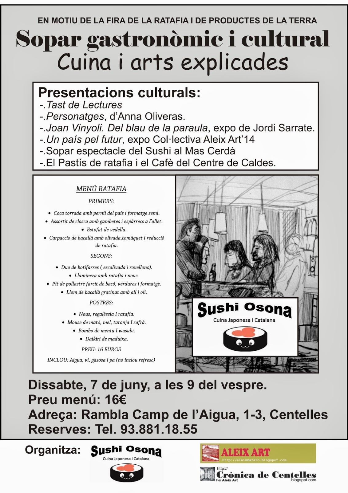 Avui puc parlar amb propietat d’un nou projecte de suport cultural que ens hem inventat i presentem el proper 7 de juny al restaurant Sushi Osona. Tot ve de que volem que es presenti a Centelles un pastís de ratafia molt bo que fan al restaurant el Café del Centre de Caldes de Montbui. La fórmula que hem trobat per presentar-lo és introduir-lo dintre un sopar, on serà presentat com es mereix, pels seus creadors i ànimes del centre calderí, que també és un nucli cultural. Entorn a aquestes postres, que volgudament volíem relacionar amb les fires gastronòmiques del nostre poble, hem vist que podíem posar l’accent amb destacar coses que passen o que es preparen. En el blog Aleix Art, intento fer això en la secció Salonet. Per això hem programat una macedònia de propostes culturals, en viu. Assentats a la taula, en el transcurs d’un deliciós sopar que prepararà l’Esther Cortiella, es presentaran fins a cinc propostes culturals: la revista de lectures “Tast” (veure Salonet), el llibre premiat i publicat de l’Anna Oliveras, l’exposició que Jordi Sarrate prepara entorn a Vinyoli amb tots els actes performatius que l’acompanyen. Un servidor també podrá parlar de l’exposició Col·lectiva Aleix Art 14, que ja s’està apropant. L’Esther, o la seva companya Chris, també ens parlarà de la seva cuina i també d’un sopar-espectacle que preparen fer al Mas Cerdà, el pròxim 1 d’agost. Al sopar serà bo venir-hi amb l’agenda per apuntar-se els actes amb els que s’enriquirà l’oferta cultural. Evidentment, la proximitat de comensals i presentadors culturals, permetrà que hi hagi preguntes i diàleg. La idea és oferir les presentacions, al començament, entre plat i plat i a les postres. El Sushi és un lloc petit, però vint persones hi caben.El Sopar gastronòmic i cultural es fa aprofitant el cap de setmana de la fira de la ratafia. Això vol dir que al passeig hi hauran parades i que als locals de costum hi hauran tallers i activitats. Però també arriben altres propostes, que apretarant l’agenda: a les 7, s’inaugura l’expo de’n Musach al Marçó. A les 8 hi ha la Missa jove amb la col·laboració del grup Baobab. Diumenge és el dia que de la capta dels del Càncer, que repartirant “banderetes” adhesives, amb les guardioles cilíndriques.