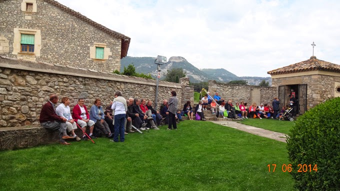 El nostre grup va ocupar un dels dormitoris. Els nens dormiren al terra, sobre estarilles i dintre sacs de dormir. I els adults en les habitacions, amb llit de matalàs tou. Això va ser el de menys. Ens vam passar bona part de la tarda i de la nit de divendres, jugant a jocs que els nens havien preparat als adults, amb pistes i mapes per tota la casa. I després a una gimcana que els adults els hi havíem preparat amb tresors repartits per tot el jardí. A les 3 ens posàvem al llit i a les 7 els nens ja havien acabat la son. Es va fer tard sense pressa, perquè ens ho passàvem bé. Però el cert és que a les 9 del matí havíem d’estar fora de la casa i encaminats cap a Puiggraciós: allà havíem de passar el dissabte. Vam començar a caminar cap a les 11. Una hora bona perquè el sol bronzegi la pell. Tard. Però ens ho vam prendre amb molta calma i paràvem a cada ombra per agafar forces. Així que una excursió que amb el xip d’una matinal hauríem fet amb 45 minuts, vam tardar-hi tres hores. No tots eren caminadors habituats, feia sol i calor, hi havia nens i vam haver fer un bon tros per la carretera, que és molt pesat. Amb tot, ningú es va queixar. Hi havia predisposició. Ens vam anar esperant. Vam xerrar, vam riure. Als nenes els van regar amb aigua, un jardiner i tots vam arribar bastant dignament al santuari. Allà. No hi havia les monges, que eren de celebració al monestir mare, de Sant Pere de les Puel·les. Però ens havien deixat permís per fer el dinar al jardí reservat amb taules i cadires que tenen a la part de sobre.