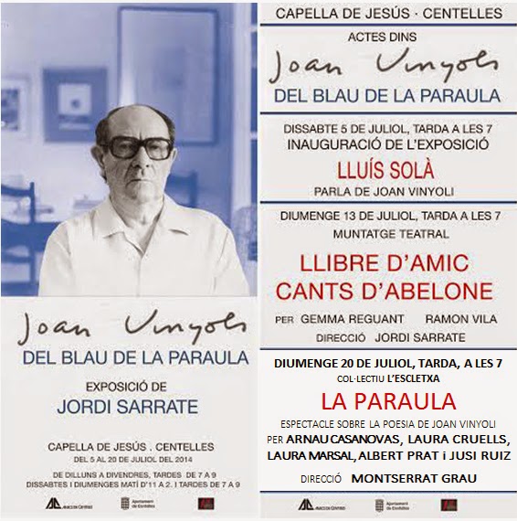Centelles. Ara a les 7 de la tarda s’inaugura a la Capella de Jesús una mostra de Jordi Sarrate dedicada a la poesia de Joan Vinyoli. L’any passat va tocar Espriu, ara Vinyoli també en motiu del respectiu centenari del seu naixement. El dia de donar llum va ser dijous passat, 3 de juliol, que a Barcelona es feia un espectacle. A Centelles, aquell dia, Sarrate i els col·laboradors estaven muntant l’exposició, que també serà cau de recital i muntatges dramatitzats.