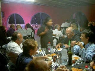 A part del cartell, vaig tenir ocasió de col·laborar una mica en els preparatius i de posar la pota: dintre el cubell que servia de glaçonera hi vaig tirar una bossa de “cubitos” petits, per mojitos. No vaig distingir entre bosses. El monologista sí que sabia què feia: la seva xerrada estava carregada de contingut adult però també va fer esment dels temes de sempre, des d’un punt de vista molt picaresc, documentat i amb corda per estona.