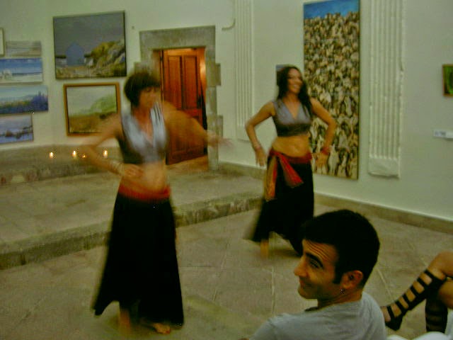 Aquest talleret de cuina que ferem a la mateixa capella en horari de l’exposició, serà de fet la quarta de les activitats paral·leles programades. Divendres passat va començar-ho la Pili Vila. Ella i una seva companya van fer dos balls de ritme oriental, vestides airosament, de colors alegres i deixant a l’aire la panxeta. Però no era dansa del ventre. De fet, almenys al primer ball elles mateixes van explicar que havien creat la coreografia. La Pili explicava que en aquest ball, la dona es situava en el paper d’una deessa i que oferia com un cant a la vida. Les espelmes que portaven eren una alusió a la crisis bèlica que ens assota aquest estiu, sobretot a Ucraina i al Pròxim Orient (Síria, també).