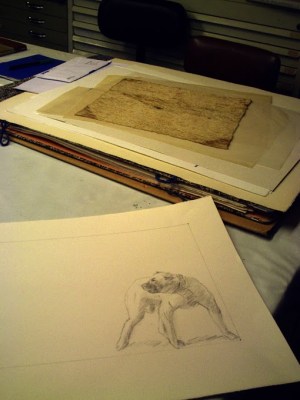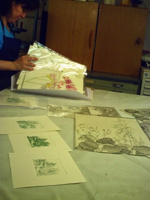 Després de la primera visita hi he tornat fa molt poc per repescar idees i tirar noves fotos per encaixar l’article dintre el monogràfic dels Treballs d’Estiu. Però el seu treball d’estiu està sent –i com en casos més propers-, el de posar ordre i netejar el taller. Inclús ordena la biblioteca seva i per això m’ha passat tres llibres molt xulos, que ja he ingressat a la biblioteca Aleix Art –el més pintoresc és un repàs de la joguina a Catalunya, escrit per Corredor-Matheos-. En aquesta segona visita, els gravats pel mini-print ja estan acabats i entregats. El què m’ensenya, de nou, és un dibuix d’un gos que va fer, fa anys, per preparar una sèrie de litografies per a la firma d’aliments canins, Purina. Se’n va al interior del taller i hem treu una col·lecció de quatre estampes que va fer i es van distribuir entre clients i col·leccionistes. Quines coses feien abans les empreses! Avui aquest tipus d’iniciatives no són tant habituals. Torres va haver de fer quatre escenes de gossos de caça, perseguint o el senglar o el conill, per promocionar uns pinsos per gossos de presa. Es tracta d’uns treballs de perfil naturalista, ben detallada l’anatomia i l’entorn vegetal. Fets amb llapis gras, tocs d’aiguada. Es tracta d’un treball interessantíssim, però tècnica i temàticament una mica allunyat dels interessos propis de la Marta. El gos del dibuix, que ha ensenyat primer, ja és més mansoi. I és que la naturalesa que li interessa és més quieta i tranquil·la: les plantes, les flors. En fa dibuixos i gravats. Litografia, ja no, perquè creu que el què pot fer amb aquesta tècnica ja li dóna el dibuix. I amb el gravat calcogràfic troba una altra sèrie de virtuts més interessants, com la calidesa de la línia.