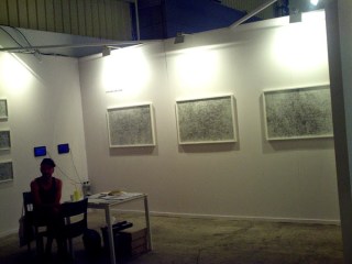 Swab organitzava els stands per àrees geogràfiques i també per accentuar algun tema, per exemple el dibuix. Així hi havia força galeries de Berlin i també –com dèiem de Budapest-, però també Shangai. Hi havia stands de galeries apropant obra de varis creadors o també d’un sol artista, com és el cas de Philipp Haffner. Artista berlinés, venia de la mà de Vanja Contemporany. El seu espai mostrava una col·lecció de dibuixos de traç de línia. Una espècia de croquis sobreposats sobre altres croquis, com fent un mapa amb capes. Vaig poder demanar al mateix Haffner com s’ho feia per mantenir la idea del dibuix que executava, sense perdre’s, en mig del garbuix dels traçats subjacents. No perd la línia. Es veu que s’ajuda amb la base d’imatges digitals per anar com calcant i anar sobreposant cada tema. El resultat és interessant. Si bé es perd la idea del tema o temes, resulta una resposta interessant per jugar entre realitat i abstracció i al mateix temps, em sembla una imatge genial de reflex de la sobreabundància d’informació. En el text que l’artista facilitava, explica que els dibuixos resulten de la recerca de diferents conceptes a la xarxa.