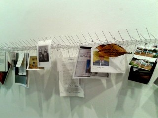 L’exposició no presenta obres acabades, sino peces que les documenten –fotos, records, vídeos, etc-, i altres que formen part del procés de treball, com aquest conjunt de retalls i imatges que formen els Diaris del Pensar, presentades com si fossin idees sueltes i successives. Hi ha referències a l’obra d’un tortell i a una altra de la pela de la taronja, com a metàfora del temps, però no acabo d’entendre el seu significat intrínsec. En un vídeo, el tortell, emplatat, va girant-lo una mà, i a cada volta una veu en off –i escrits en alemany-, afegeixen un comentari o una idea. Al final la mà el trosseja i se’l menja. Evidentment hi ha una relació entre el present i el passat, a mesura que el tortell gira, ja que l’acció transcórrer durant un temps determinat. Però no hi se veure les implicacions, ni si el sentit va per un altre cantó.