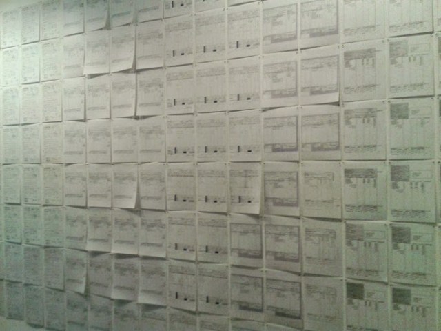 Personalment, crec que l’exposició podria funcionar únicament, només amb l’obra que hi ha a la paret gran. Centenars de papers blancs penjats, amb la impressió de la col·lecció vital de nomines de l’artista, que venen a mesurar l’existència de l’artista a partir del seu pas salarial per una escola d’art. Avui en dia molts artistes només poden ser-ho si tenen una feina que els permet sobreviure i els hi deixa un petit marge per poder-se tancar al seu taller. Només amb aquesta obra ja tindríem tema de conversa durant hores!. És simple, feta amb material verídic, testimoni del pas dels anys, la fluctuació dels honoraris, les taxes contributives i la pura realitat de la majoria d’artistes del nostre entorn que conec.