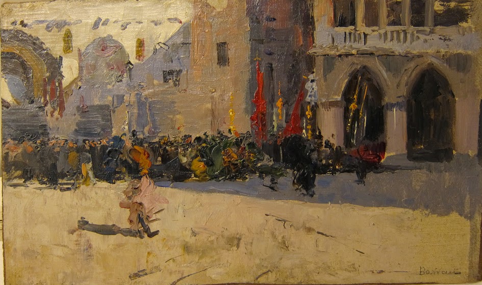 Tota la sala de la “capella” conté una sèrie de pintures de petit format. Tots són olis, sí, però hi ha més: vàris suports són o fustes o cartró. També hi ha diverses obres que tenen un aire d’esbós. De plantejament ràpid. Alguns temes ja ho afavoreixen: paisatges, natures mortes. És difícil precisar si totes les obres són estudis previs per altres obres més definitives. No cal que sigui així. Els responsables de la galeria ens indiquen que potser un dels conjunts de Martí Alsina siguin estudis preparatoris. Però en d’altres casos en tenim prou en admirar la pericia d’un o altre artista davant el repte. Hem esmentat Martí Alsina. Hi ha un altre Martí Alsina que és com una Odelisca que bé podria ser un quadret de Fortuny –pel tema-. I en canvi, al seu costat, hi ha un paisatge de Fortuny que també podria ser un Martí Alsiana. Però la mà és la de cadascú. També hi ha pintura de Manolo Hugué. M’agradaria ser com un caçador i poder dirigir certes peces cap a certs llocs. Un Manolo cap al Museu Thermalia. Però també hi ha una natura morta de Pau Roig! Coneixíem aquest artista pels seus gravats i no gaire per la seva pintura. I m’interessa, per exemple, la manera com tracta les flors. Ja que reconeixem l’espècia i el tipus de pètal, just gràcies a taques de pintura, d’una manera que em resulta familiar: fa uns mesos parlàvem d’un recurs similar en uns treballs de J. L. Pascual.