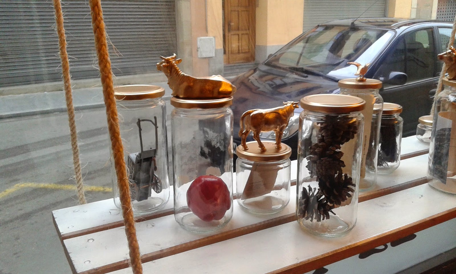 L’aposta de l’Alda Rabionet constitueix en aquest sentit una proposta nova, ja que és un exerici lliure i uneix concepte, escenografia i disseny. És un aparador on l’art fa un pas endavant. Hi ha art en el disseny i també en estils: conceptual, minimalista, barroc, colors. etc. I com qualsevol bona obra d’art té una mateixa missió: generar empatia. Per l’aparador de les Finestres el tema estava cantat: ens trobem en el Trabuc i a l’Alda li ha tocat les dates de Nadal i de les Festa Major d’Hivern. Per tant el tema per nassos havia de ser la Festa del Pi. L’instal·lació de la jove creadora ocupa les dues finestres grans. A cada una hi trobareu… a mi em recorden “columpios” o bancs de llistons de fusta blanca, penjats amb cordes. A cada banqueta hi ha diversos pots de conserva: a dintre hi trobareu diversos elements de la festa centellenca i a sobre la tapa, una sèrie d’elements daurat, generalment animals, com els bous o ocells.
