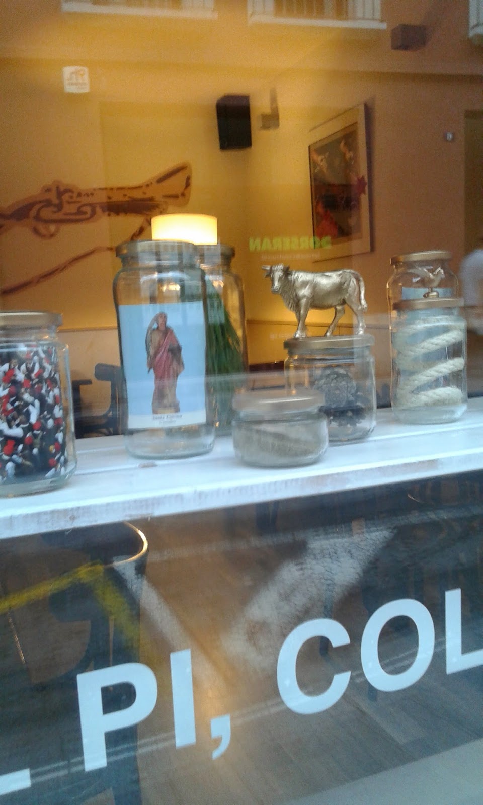 La idea de l’Alda ha estat convertir en “producte” la Festa. Perquè hi ha elements de la festa que es troben a les botigues (com les colometes de galeta, el lícor, llibres, etc), però la festa en sí, no. Diguem que l’Alda intenta amb els seus pots capturar, conservar i oferir-nos l’essència. Com si fossin rèliquies o fòssils que perduraran pel futur. Ens consta que l’Alda és una seguidora de la Festa del Pi i que se l’estima.Hi ha més aspectes que fora bo contrastar-ho amb la mateixa artista, per saber millor el seu pensament directe i també intentar saber més del seu concepte creatiu. Per exemple, el sentit últim del títol de la mostra “El pi, Coloma!” Però com que és impossible de precisar quant serà això, us deixo aquest post a moda d’interpretació i invitació a conèixer aquesta nova instal·lació artística a les Finestres.