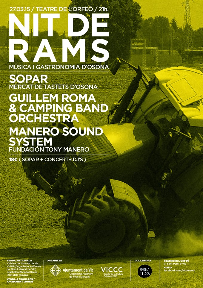 Seguint un esquema similar, però destinat a un públic més ampli, aquest proper divendres, a la nit, a l’Orfeó, es presentarà una altra vetllada que combinarà gastronomia i música comarcal. Abans de que Guillem Roma i la seva banda, presentin per primera vegada a la Plana, el seu nou treball; formatgers, cervesers i altres productors alimentaris agrupats en Osona Terra, oferiran un menú de tapes, que la gent podrà anar provant, a canvi d’intercanviar, primer tiquets i després monedes. Després del tastet i de l’actuació de Guillem Roma, actuaran un grup de dj de la Fundación Tony Manero. És en aquest espai on hi retrobarem una nova intervenció de l’Alda Rabionet, per “determinar” l’espai d’acord amb la vetllada de divendres. De moment és una sorpresa.En converses amb organitzadors de l’esdeveniment, ens asseguren que és una proposta on hi pot anar tothom i que els més exigents si trobaran satisfets. Com a mínim el cartell musical assegura una bona digestió.