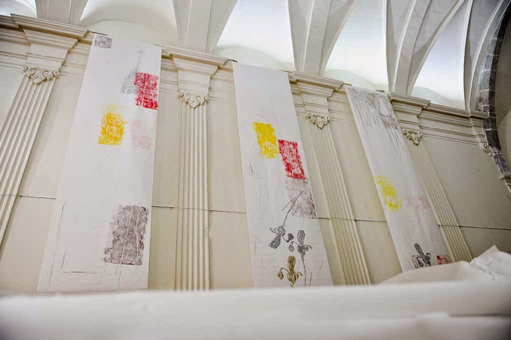 Centelles. Ahir al blog germà, presentàvem el concepte “gravats pictòrics”. No vull dir que l’hagi inventat, sinó que com a concepte va bé per definir un tipus d’obra –molt ben feta-, que té més de pintura, per l’aparença i concepte, que un gravat (potser he fet un pas endarrere). El cas és que a la Capella de Jesús de Centelles, des de fa uns dies, també hi pengen uns papers estampats. Uns papers xina de més de cinc metres de llarg per un d’ampla, amb “taques de diferents colors” que evoquen la forma d’uns iris, unes flors similars als lliris.