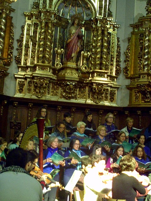Per tant aquesta tarda a Centelles, a partir de les 6, hi ha hagut aquesta estrena del Rèquiem de Goodall. Parlem de cent o cent-cinquanta persones, entre cantors i instrumentistes, repartits entre la zona de l’escalinata del presbiteri i dels primers bancs. En aquesta disposició inusual, el director Joan Barceló, dirigia des de la tarima del mossèn, que han situat al terra de la nau. Entre els integrants de l’orquestra, a més d’alumnes avançats, hi havia també varis professors que s’ocupaven sobretot de la secció de cordes. Entre els instruments hi havia també una arpa. I també tres contrabaixos, en un dels quals hi havia un “mallorquí d’adopció temporal”, com és el contrabaixista centellenc Joan Druguet Sallent.