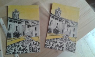 Per plantejar l’exposició al Trabuc, ens va atrapar la qualitat dels darrers dibuixos. Però al revisar els anteriors ens adonem que el dibuix original és cent elles millor que el que permet l’enginyeria del plàstic: en els que tenen un plantejament més bicolor, hi trobem recursos de veladures i aiguades atmosfèriques de tons grocs i lluminosos que resulten molt càlids. La Tere a més té ull i recursos per representar llocs comuns, com la Plaça Major, amb els músics; o l’escultura de Cerdà de l’entrada del poble. En aquest cas va fer servir un collage per apropar-se millor a la filamenta metàl·lica del prohom representat amb acer per Jordi Díez. La Tere Roma utilitza sovint matèria aquarel·lable o similar. Per exemple, aplica una espècia de pastel que es pot aigualir. Em sembla que també utilitza gouache (com dèiem de Josep Obiols, en un post al blog).