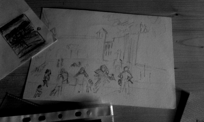 Per plantejar l’exposició al Trabuc, ens va atrapar la qualitat dels darrers dibuixos. Però al revisar els anteriors ens adonem que el dibuix original és cent elles millor que el que permet l’enginyeria del plàstic: en els que tenen un plantejament més bicolor, hi trobem recursos de veladures i aiguades atmosfèriques de tons grocs i lluminosos que resulten molt càlids. La Tere a més té ull i recursos per representar llocs comuns, com la Plaça Major, amb els músics; o l’escultura de Cerdà de l’entrada del poble. En aquest cas va fer servir un collage per apropar-se millor a la filamenta metàl·lica del prohom representat amb acer per Jordi Díez. La Tere Roma utilitza sovint matèria aquarel·lable o similar. Per exemple, aplica una espècia de pastel que es pot aigualir. Em sembla que també utilitza gouache (com dèiem de Josep Obiols, en un post al blog).