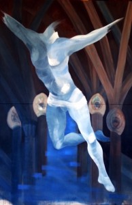 El cas és que m’és fàci connectar amb el treball de l’Alba Roqueta, simplement perquè també m’interessa a mi capturar el moviment per exercitar el dibuix i la descripció anatòmica en moviment. És un exercici estimulant que va formar part dels dibuixos dedicats als assajos de musica dedicat a Tarzan i de les planxes linogravades directament, dedicades a la Zenda. Des d’aleshores que, per exemple, m’he fixat que hi havia posicions que eren com les que sempre dibuixava. Dibuixar o pintar persones ballant amb els braços estirats o drets, resulta més representatiu, però també són com les més fàcil, alhora de capturar d’un moment de la coreografia del cos. Les superposicions a través de veladures d’Alba Roqueta, li permet anar una mica més enllà i valorar pictòricament el moviment del cos, en actituds “més tancades”, però que formen part, com les “obertes” del ball. Les meves sèries són de dibuixos fets in-situ i alguns gravats després. L’Alba pinta: la intensitat o opacitat de la pintura permet a l’Alba, a través de la matèria pictòrica, suggerir l’organicitat de l’anatomia masculina i femenina, en moviment. En aquest sentit, el treball de l’Alba, potser per ser pictòric, ofereix una versió més acabada… o més ben dit, més descriptiva i detallada del que en dibuix un servidor explicava de manera més esquemàtica. Digue’m que la proposta pictòrica de l’Alba entra més en el tema. Em sembla una proposta xula pictòricament i al mateix temps alliçonadora cara l’ampliació d’un tema similar en un altre camp. Roqueta va fer el seu treball o el situa en el marc d’unes escenografies gaudinanes, accent estilístic que li permet donar nom a la sèrie. Una bona aposta!