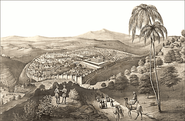 | Gravat historicista de Jerusalem, amb informació que subratllen imaginari sobre la ciutat. |